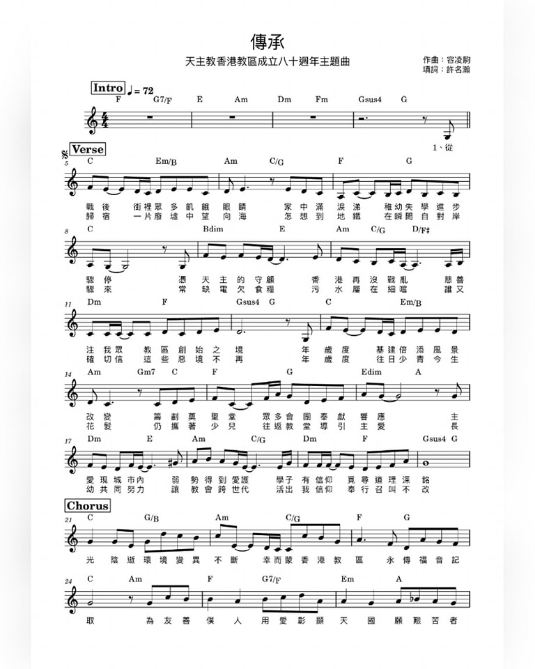 adminUncategorized21 1 月, 2026《傳承》樂譜天主教香港教區成立八十週年主題曲《傳承》推出至今,你們聽了多少次呢?小編loop了好幾次,覺得這是屬於香港教友今年的「主題曲」為了更好推廣這首《傳承》,感謝容凌駒先生提供了主題曲的樂譜,讓大家下戴使用。想在街上邊行邊聽?我們亦提供mp3版本下戴!上述資源皆可在以下Taplink找到https://taplink.cc/jubilee2025_hk#CDHK80 #教區80 #希望的傳承者 #MessengersofHope